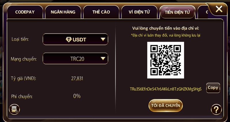 Phương thức nạp tiền điện tử được SunWin triển khai riêng cho người dùng thích thanh toán bằng tài sản số. Hệ thống cung cấp địa chỉ ví và mã tham chiếu để hạn chế nhầm lẫn. Giao dịch được xác thực sau khi mạng lưới blockchain hoàn tất kiểm tra khối, thời gian xử lý có thể thay đổi tùy vào từng loại token.