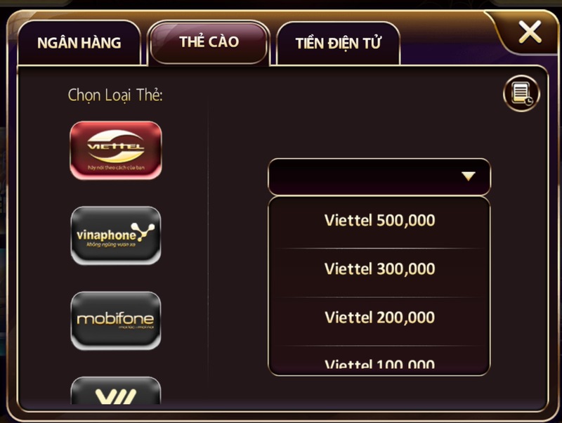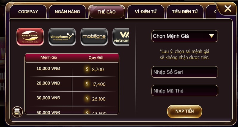Nạp qua thẻ cào và kiểm tra mệnh giá hỗ trợ